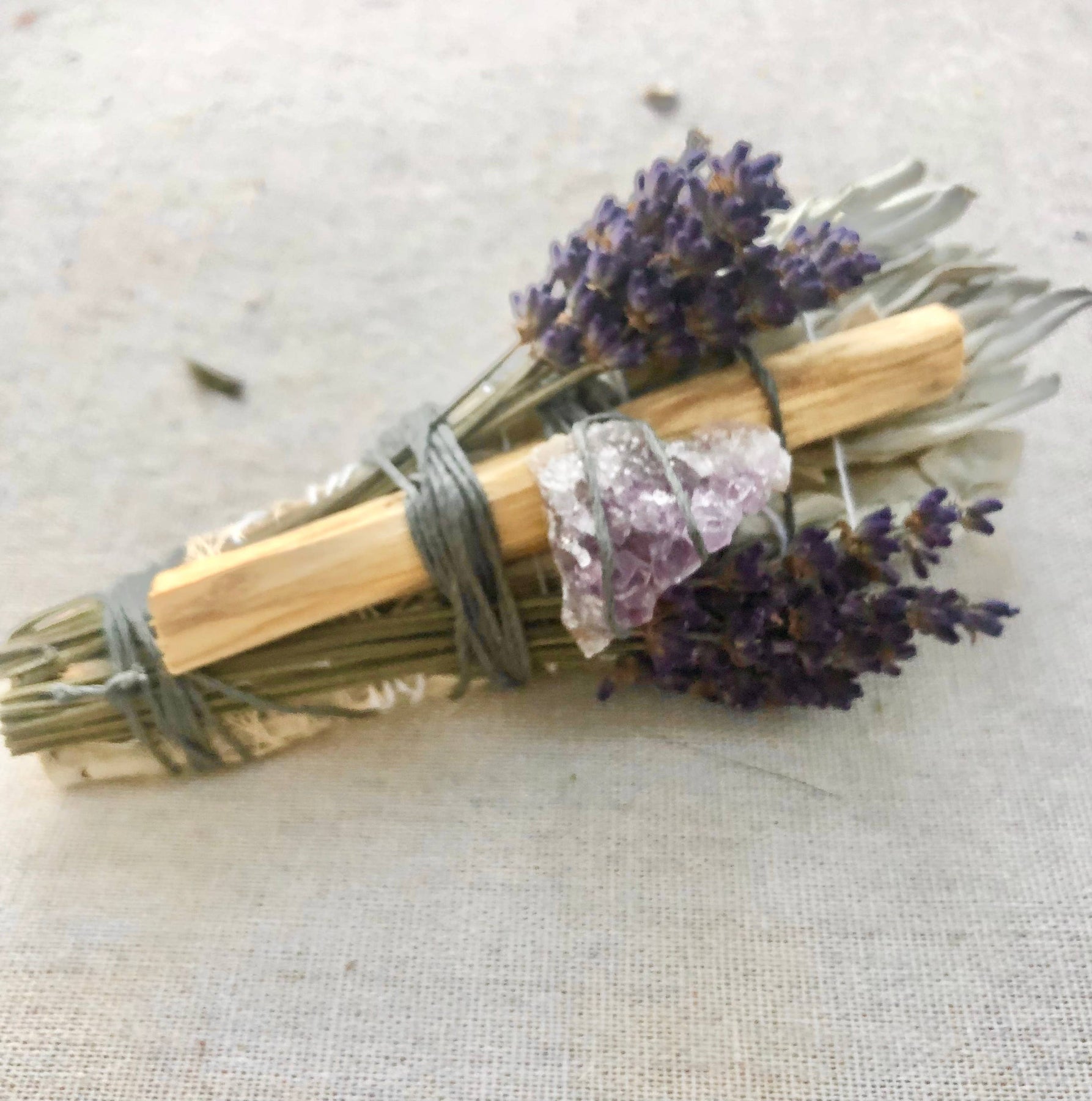 Organic and sustainably-harvested White Sage with sustainable Palo Santo, organic Lavender and a sparkly Quartz crystal.