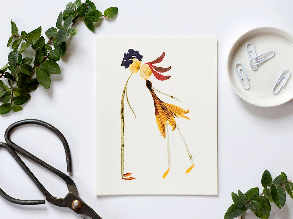 A whimsical card designed entirely from pressed flowers that I grew in my garden! Featuring the blossoms of Bleeding Heart, Hosta, Bee Balm and Lilac. A perfect card for Valentine's Day, wedding, engagement or just to say "I Love You." * A high-resolution digital print of an original piece of art. * A2 card measures 4.25 x 5.5 inches. * Includes a matching envelope. * An explanation of the botanicals used is printed on the back. * Printed on 100# Forestry Stewardship Council-certified card stock. * Blank inside for all seasons and reasons. * Packaged in an acid-free envelope to protect against shop wear. Mother Nature ... but with a lot more personality!