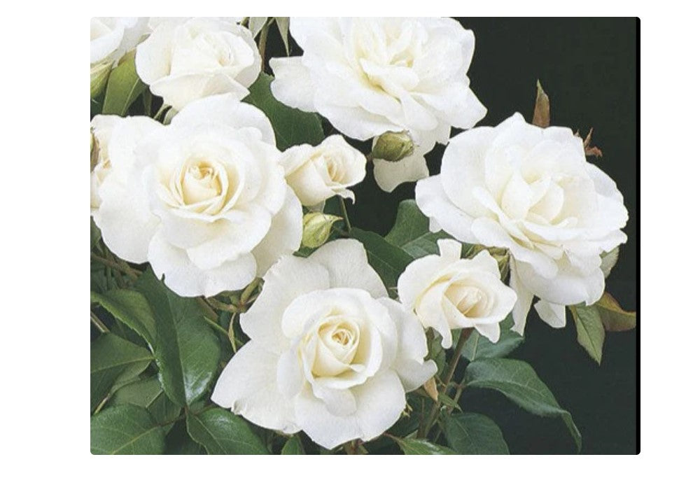 Of the top ten roses of the world and the best landscape white around, Iceberg is extremely disease resistant, vigorous and floriferous. The long-pointed buds and crisp white flowers are borne in great profusion with the least of care. The bushy rounded plant is robed in dark green foliage. Great for hedges. Hardy & floriferous. Best in mass planting.
